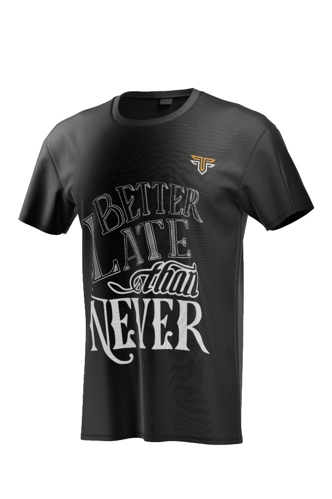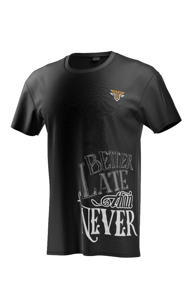 Be the first to review “Black T-shirt, bold typography “Late Better Than Never”, street style, unisex”